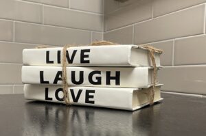 This week, we’re painting this stack of books — originally titled LIVE, LAUGH, LOVE—but you’re the author now. Use any colors you want. Rename the books if you want. Rename them to reflect your mood, your dreams, or your favorite colors… or the energy you want to carry into 2026. Be creative. You are the author and artist of these 3 books!